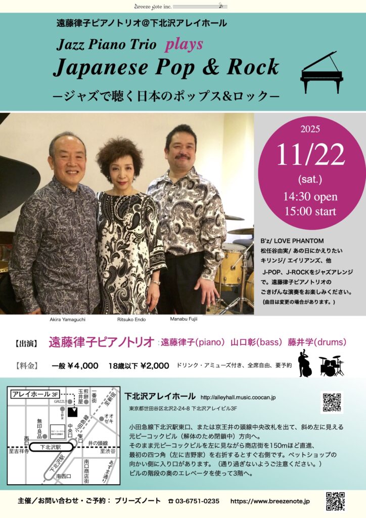 11月22日下北沢アレイホールで遠藤律子ピアノトリオ、ジャズで聴く日本のポップス、ロックコンサート。