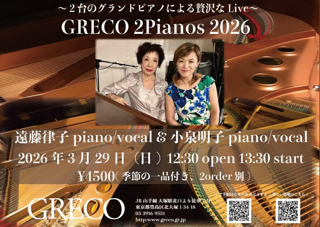 ◎3月29日大塚GRECO 遠藤律子&小泉明子2pianos2026第一部はブラジルコンテンポラリー曲とキューバのラテン風味あふれる曲を2つのグランドピアノで奏でる。第二部は歌、各々のソロ弾き語り、そして楽しいポップスデュエット。どうぞお運びください。